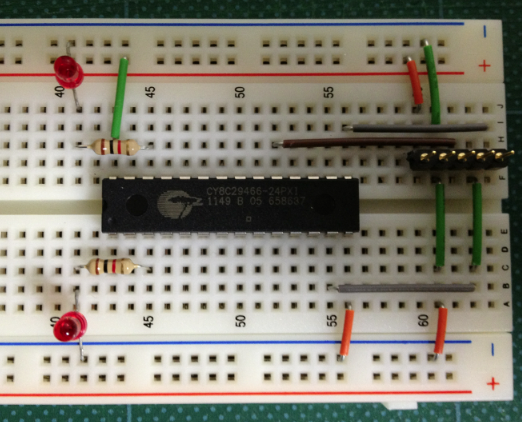 PSoCに書き込むための実験ベンチをブレッドボードに作って置くと書き込みやちょっとした実験をするときに便利です。