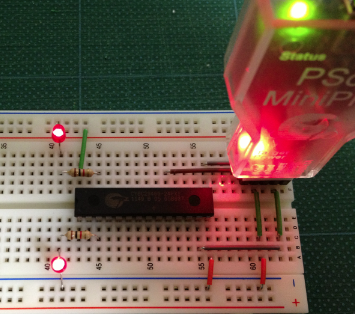 PSoC MiniProg1をブレッドボードに接続し、USBコネクターに差します。