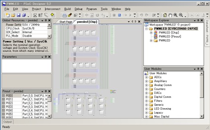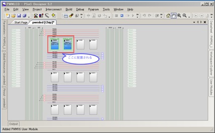 User Modules画面からPWMsを開き、PWM16をダブルクリックするとPWM16がチップ画面の左上に配置されます。配置場所は、マウスで変更することができます。 これでPWM16_1という名前で1個目が配置されました。