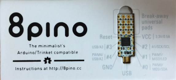 山手線ガジェットメーカーズで紹介されていた8pinoを遅ればせながら、 試してみました。当初、8pinoの創意工夫に気づかず、単なる小さなArduino と思っていましたが、 「8pino」ではじめるミニマム電子工作 (以下ミニマム本と書きます)で8pinoの開発環境や少ないピンで作品を作る著者のパワーに感動しました。