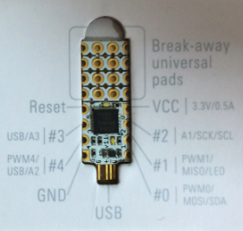 8pinoのピン配置は、パッケージにも書いてありますが、以下の表にまとめてみます。 ピン番号は、USBに差す突起の左上(以下の画像の右下#0)を1番とします。