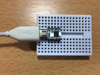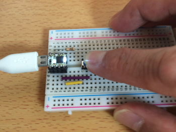 8pinoは、USB Microケーブルに直接さして、使います。 接続直後は、白いLEDが小刻みに点滅します。これがプログラム書き込み可能なタイミングを知らせています。 その後、8pinoに予め書き込まれているLEDチカチカが動き出します。