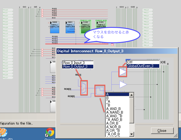 最初にPWM16_1の出力線をグローバル出力線と結線します。マウスを行出力線RO0[3]の上に持って行くと、 赤くなりますので、ここでダブルクリックをするとRow_0_Output_3のダイアログが表示されます。