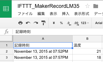 IFTTT_MakerRecordLM35スプレッドシートに以下のような記録が作成されます。
