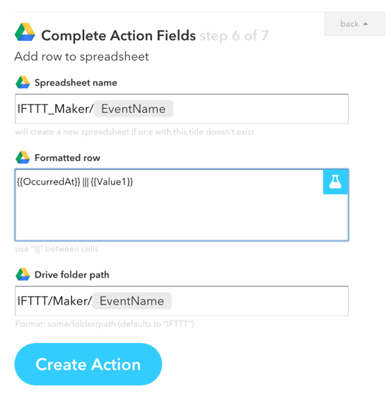 Complete Action Fields画面がでるので、Notificationに出すメッセージを入力します。 以下の様にキーワードを{{ }}で括って入力し、Create Actionボタンを押します。