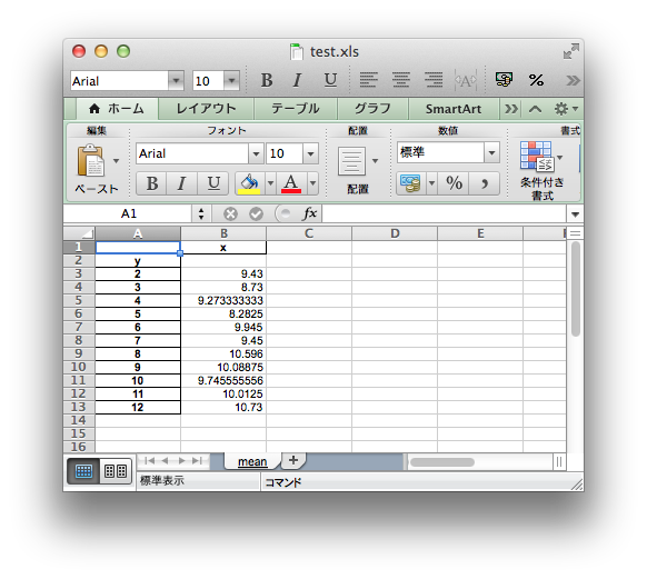 ダウンロードしたtest.xlsを開くと、以下の様に表示されます。
