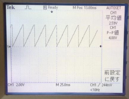 期待したとおりのノコギリ波が生成されているかオシロスコープで見てみました。
