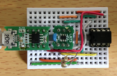 サンプリングレートが1秒間に1回程度なので、パソコンへはGPIOを使ったソフトシリアルで通信します。 *1