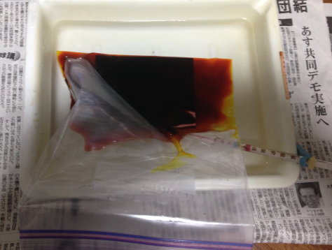 市販のジップロックにエッジング液と基板を入れ、トレイにお湯(40℃)を付けて、 割り箸で銅が溶けるのを確かめながら、エッチングします。