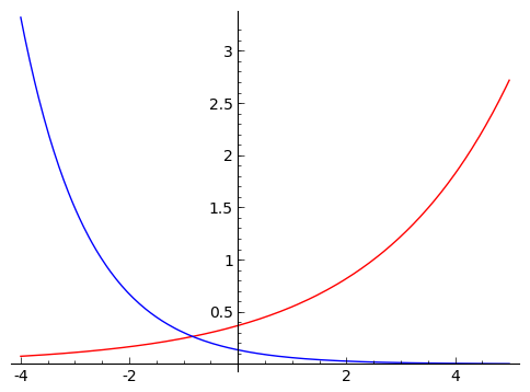 # fig3.4 p1 = plot(lambda x: exp(-1+0.4*x), [x, -4, 5], rgbcolor='red') p2 = plot(lambda x: exp(-2-0.8*x), [x, -4, 5], rgbcolor='blue') (p1 + p2).show(figsize=5)