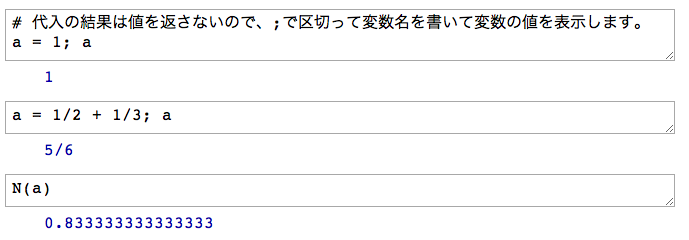 Sageでは、Pythonのインタプリタを使用しているため、Pythonの文法で記述します。Pythonでは#以下がコメント文となり、セミコロン;で複数の式を1行にまとめて記述することができます。