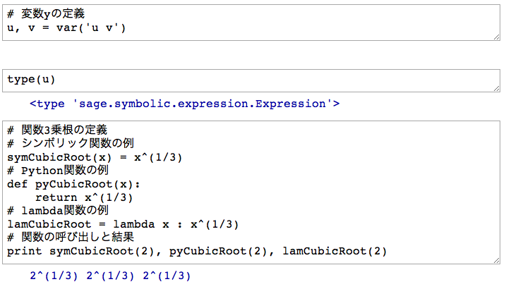 例として3乗根をシンボリック関数、Python関数、lamba関数で定義し、その結果を表示してみます(図6の第3セル以降)。