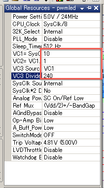 24MHzのシステムクロックをVC1にセットし、VC2=VC1, VC3=VC1/240とします。