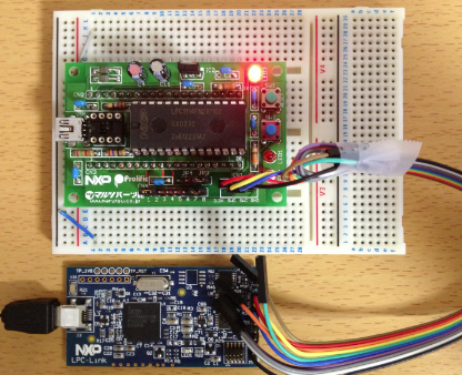 今回は、トラ技の2012/11号で付録についてきたMyARM基板とLPC-Link *1 を使用します。 写真では、LPC11U14のデバッガ部分を切り離して使用していますが、表面の結線部分をカッターで切断するだけでも大丈夫です。 *2