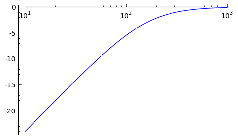 # 直接表示すると'unable to simplify to float approximation'のエラーがでるので、lambda式で回避した。 plot(lambda f: toDb(H(f, R=10000, C=10^-7)).n(), [f, 10, 1000], scale="semilogx", figsize=(5, 3), plot_points=1000)
