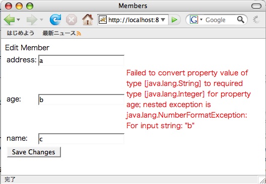 以下は、MemberクラスにInteger型のageを追加し、入力として数値としてふさわしくない"b" を入力したときのエラー出力画面です。