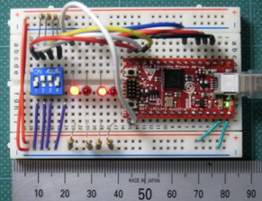 ARMマイコンパーフェクト学習基板に接続したブレッドボードのLEDとスイッチ を制御してみることにしました。
