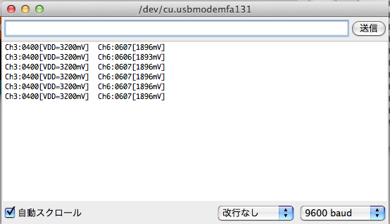pc.printf("Ch3:%04d[VDD=%04dmV] Ch6:%04d[%04dmV]\n", d0, v0, d1, v1);
