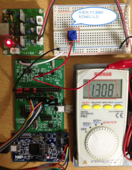 P3の3番ピンCh6に安定電源1.8Vを半固定抵抗で1.308Vに減圧して入力としました。 $$ V = (1.308 - 1.25)*11 + 1.25 = 1.888 $$ が、Ch6の予想結果です。