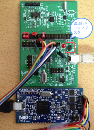 当初、ARM学習基板のトランジスタを付けないでUSB CDCのテストをしたら、 上手く動作しませんでした。本を調べて見るとUSB D+ラインのプルアップ制御に トランジスタ2SA1015が必要だと分かり、急遽取り付けました。