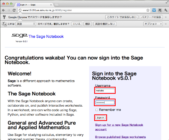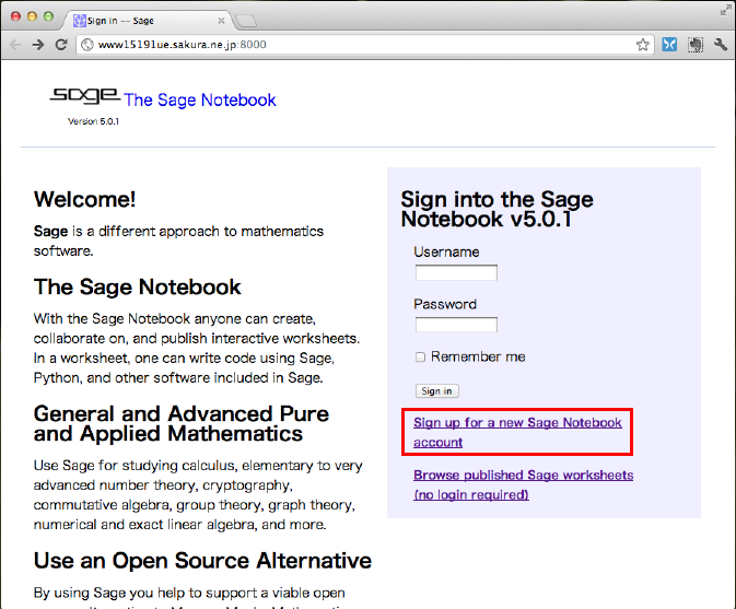 以下のようなトップ画面が表示されますので、Sign up for a new Sage Notebook accountをクリックします。