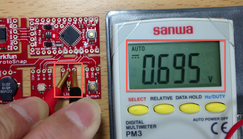 光センサーのパソコンに返す値とセンサーの電圧との関係を分かってもらえるように、テスターでセンサーの電圧を測ってみました。*2