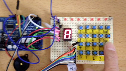 Arduinoのライブラリにkeypadがあり、これはタクトスイッチを以下の様に配線するだけで マトリックスキーボードを作ることができる素晴らしいクラスです。*3