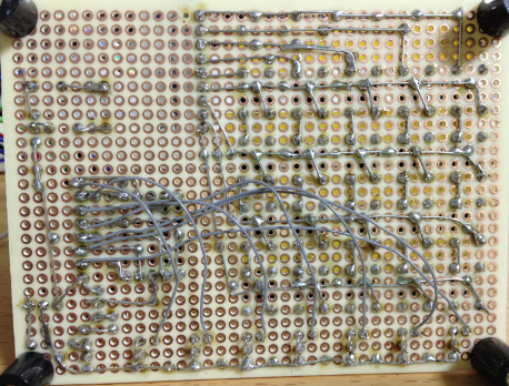 Arduino版GMC-4には、1個の7セグメントLEDと7個のLED、そして20個のタクトスイッチに 2個のトランジスタと10個の抵抗をユニバーサル基板に載せただけのとても簡単なものです。 後はArduinoのプログラムですべて処理します。