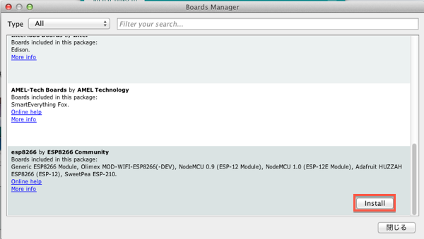 ツール→Boards Managerを選択し、スクロールするとesp8266が表示されるので、 これをクリックし、Installボタンを押します。