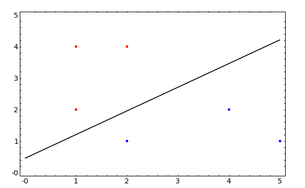 implicit_plot関数を使ってデータ(赤、青)と判別式が0となる線を表示します。 上手く赤と青の点を分離しているのが分かります。