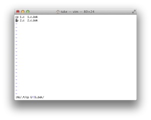 # viを起動する $ vi # lsコマンドの結果をエディタに取り込む(図42-a) !!ls # ファイル一覧から、cp ファイル ファイル.bakに置換する(図42-b) :%s/.*/cp & &.bak/ # スクリプトをshで実行する(図42-c) :%! sh # 結果を見る(図42-d) !!ls
