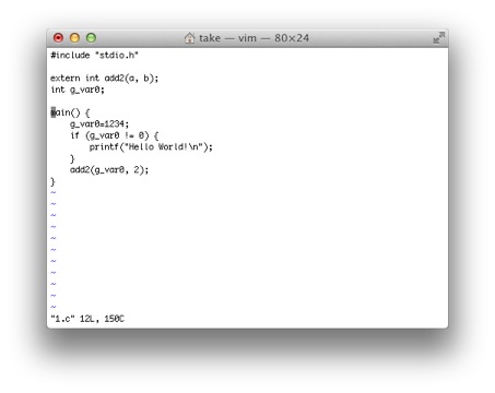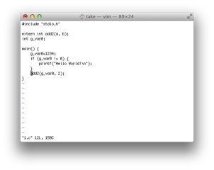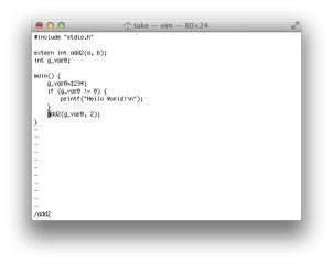 ここで、1.cのadd2でCtrl-]を入力すると(図44-a参照)、add2の定義にジャンプします(図44-b参照)。 ジャンプ元に戻るには、Ctrl-^を入力すると、mainのadd2の呼び出し元に戻ります(図44-c参照)。