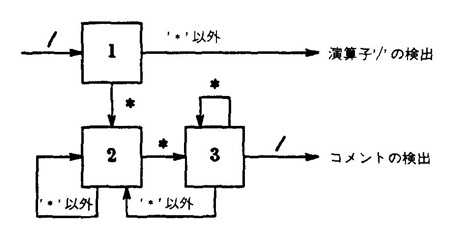 我々はいかに文字列から終端記号を構成していくのであろうか?字句解析は有限状態オートマトンの理論のための伝統的なアプリケーションである。プログラミング言語の語彙表現の仕様から遷移図を作り出すのは簡単であり、漠然と遷移図に基づいて10時間前後の時間を費やせば、どのような仕様にも対処できるであろう。文字列、コメント、そして(浮動小数点)定数を大方その順番に処理しようとすると、通常汚らしいものになる。まず、図によって、遷移図として表現されたCスタイルのコメントを考えてみる。
