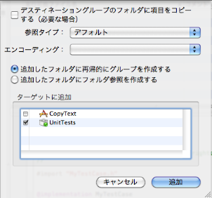 iPhone用のアプリケーションプロジェクト(ここではCopyTextを使います)に、UnitTestバンドルを追加します。