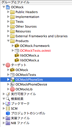 ターゲットをOCMockPhoneSimに切り替えて、Debug版のlibOCMock.aを作成します。